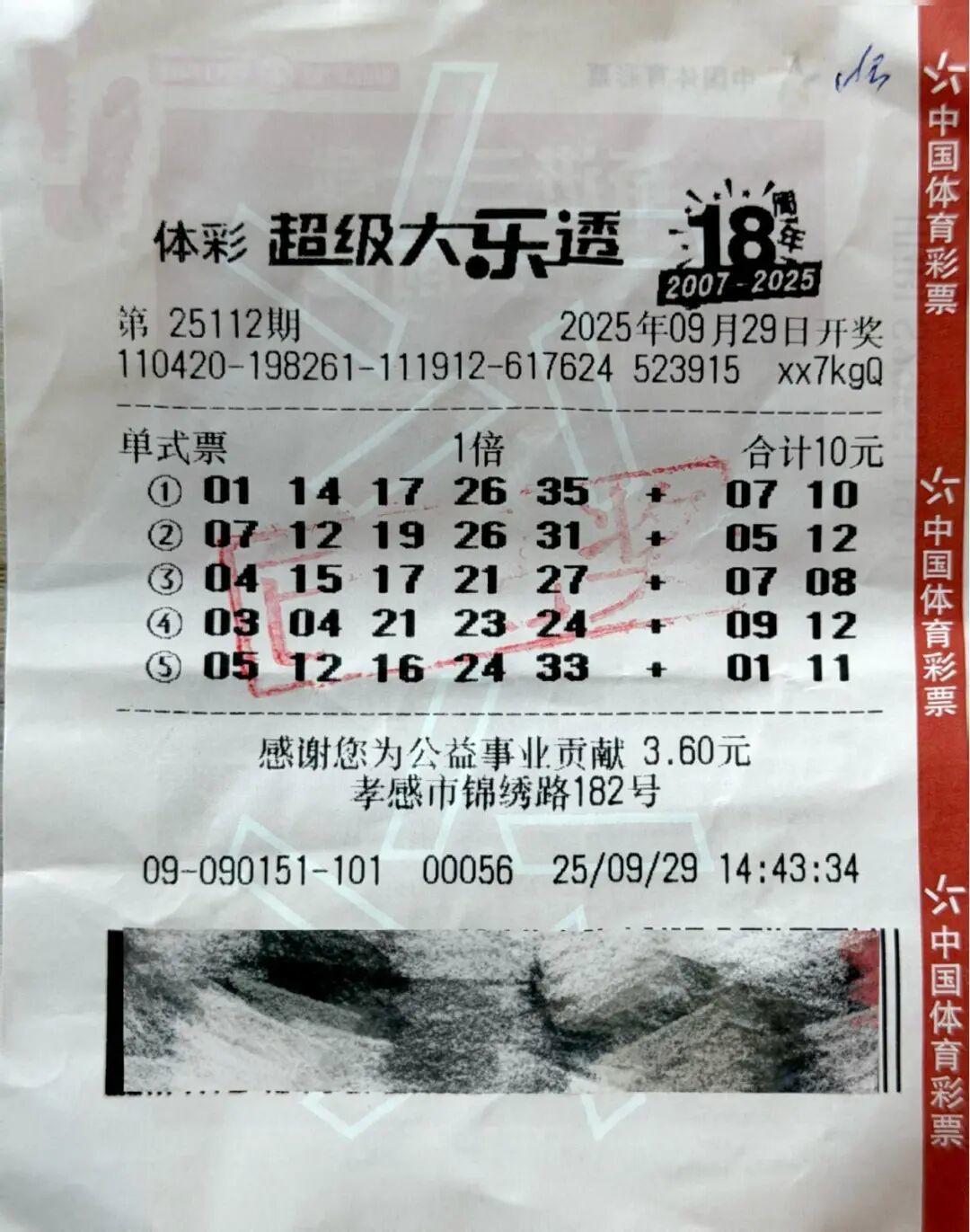 9月29日,超级大乐透第25112期开奖,当期开奖号码前区为03、04、21、23、24,后区为 09、12。全国共开出7注一等奖(1注追加),分别出自福建、天津、山西、江苏、湖北、贵州、陕西。湖北孝感90151体彩销售点售出的一张10元5注单式票命中当期一等奖1注,单票奖金1000万元。